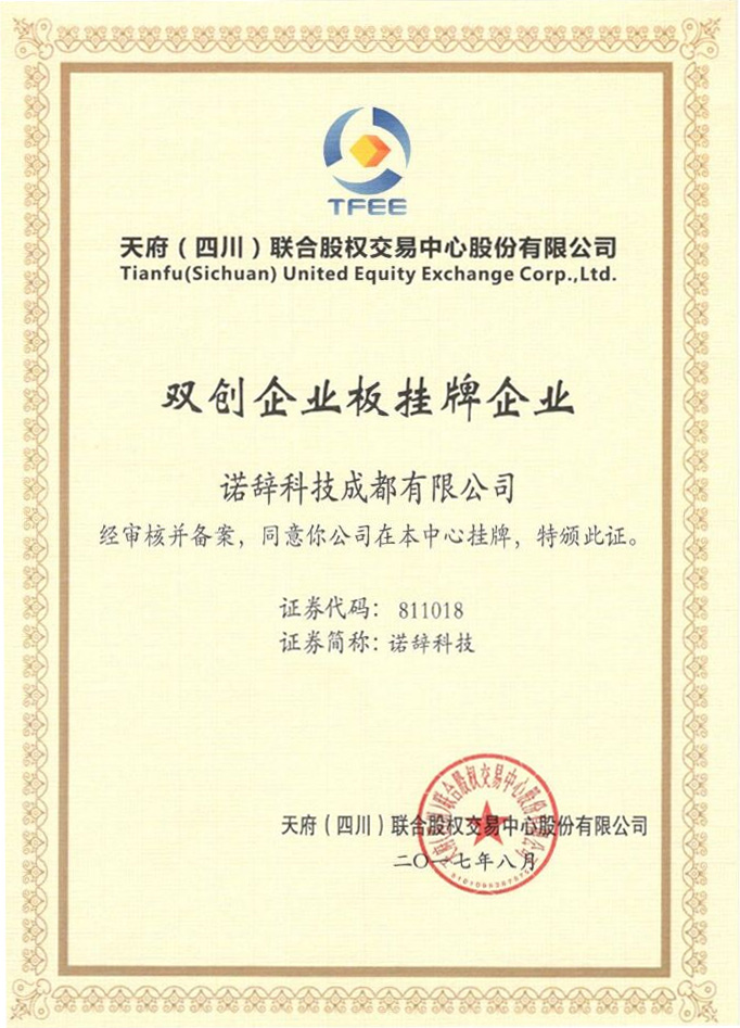 2017年12月,诺辞科技成都有限公司在天府(四川)联合股权交易中心的“双创企业板”成功挂牌,证券代码811018, 标志着诺辞科技成功在资本融资市场迈出重要的一步。